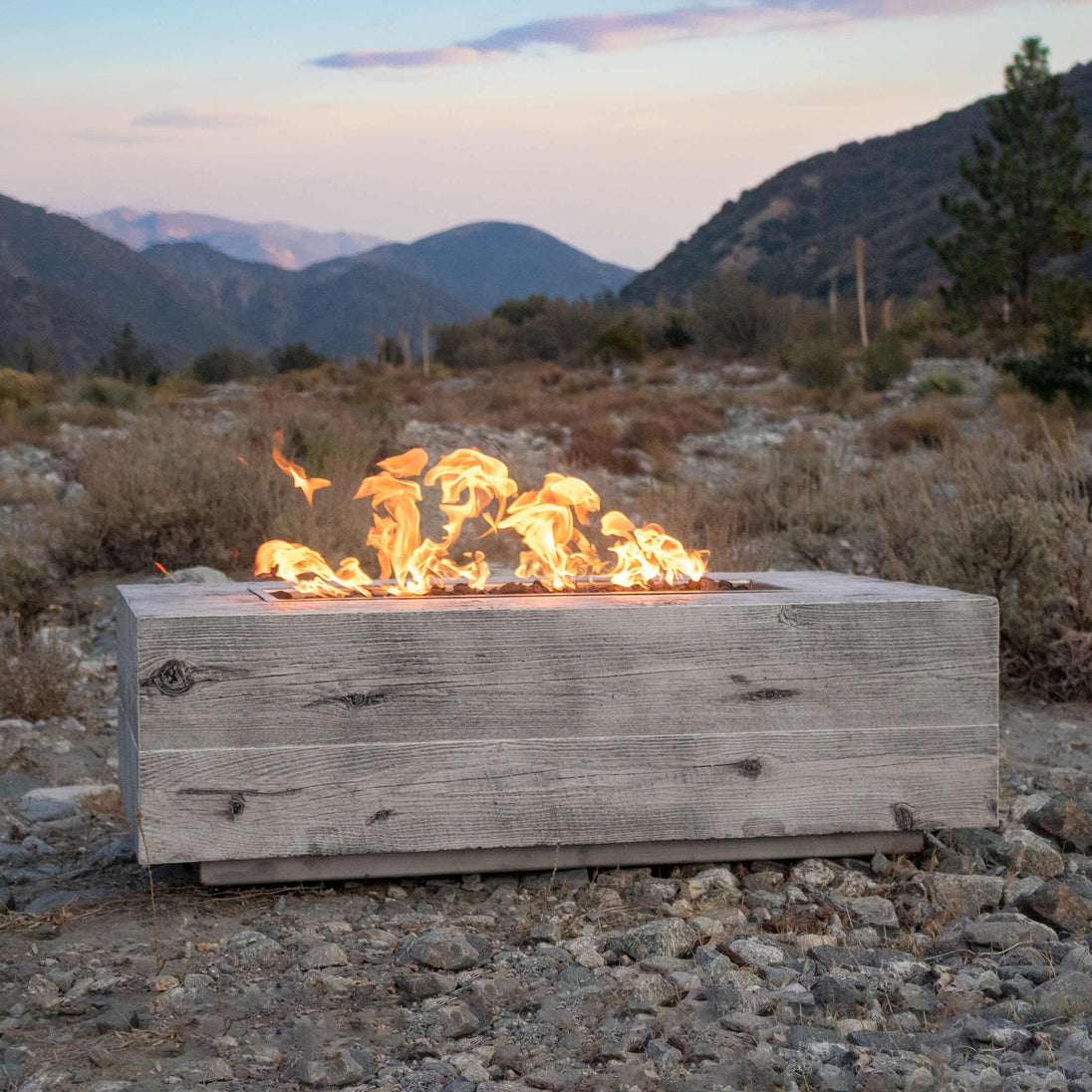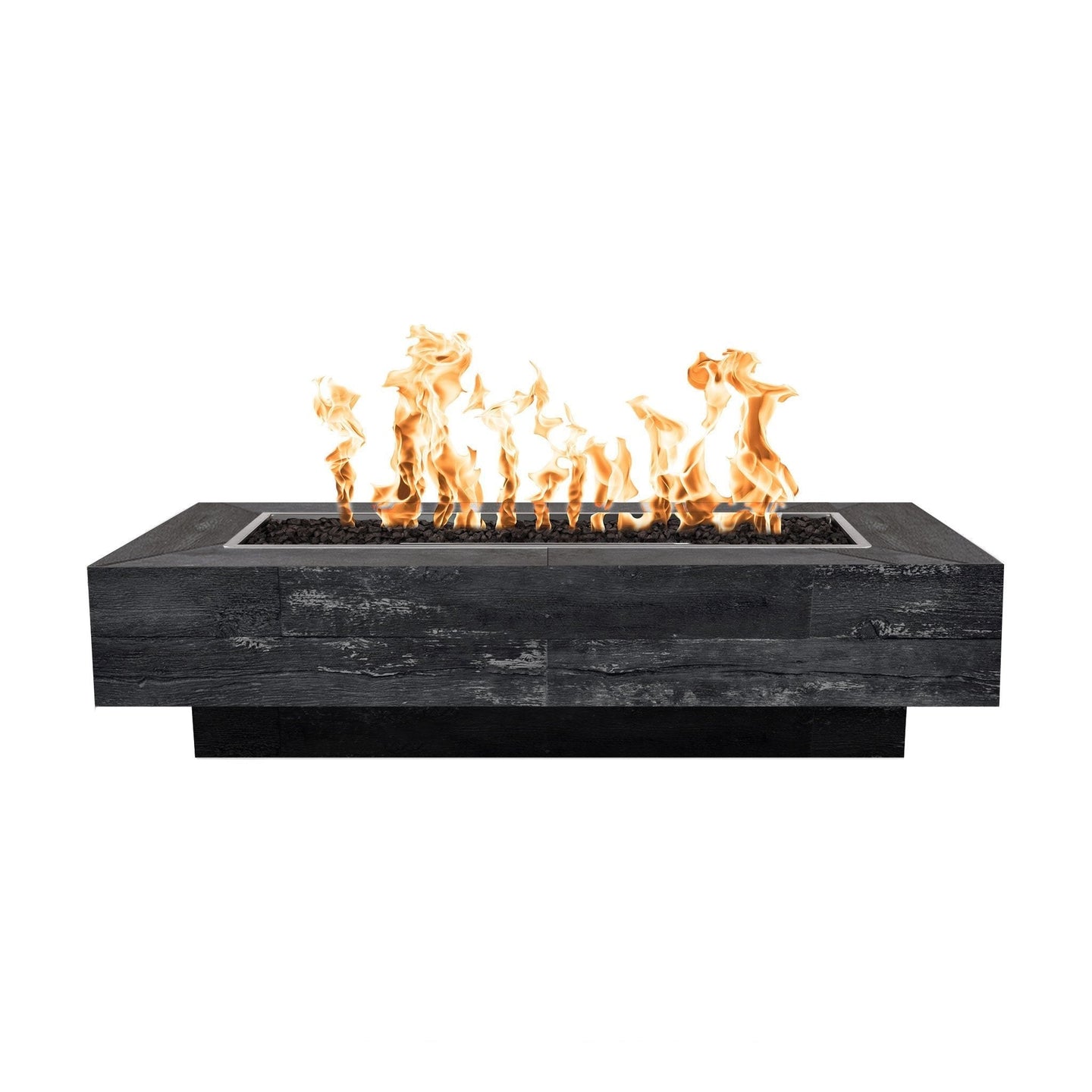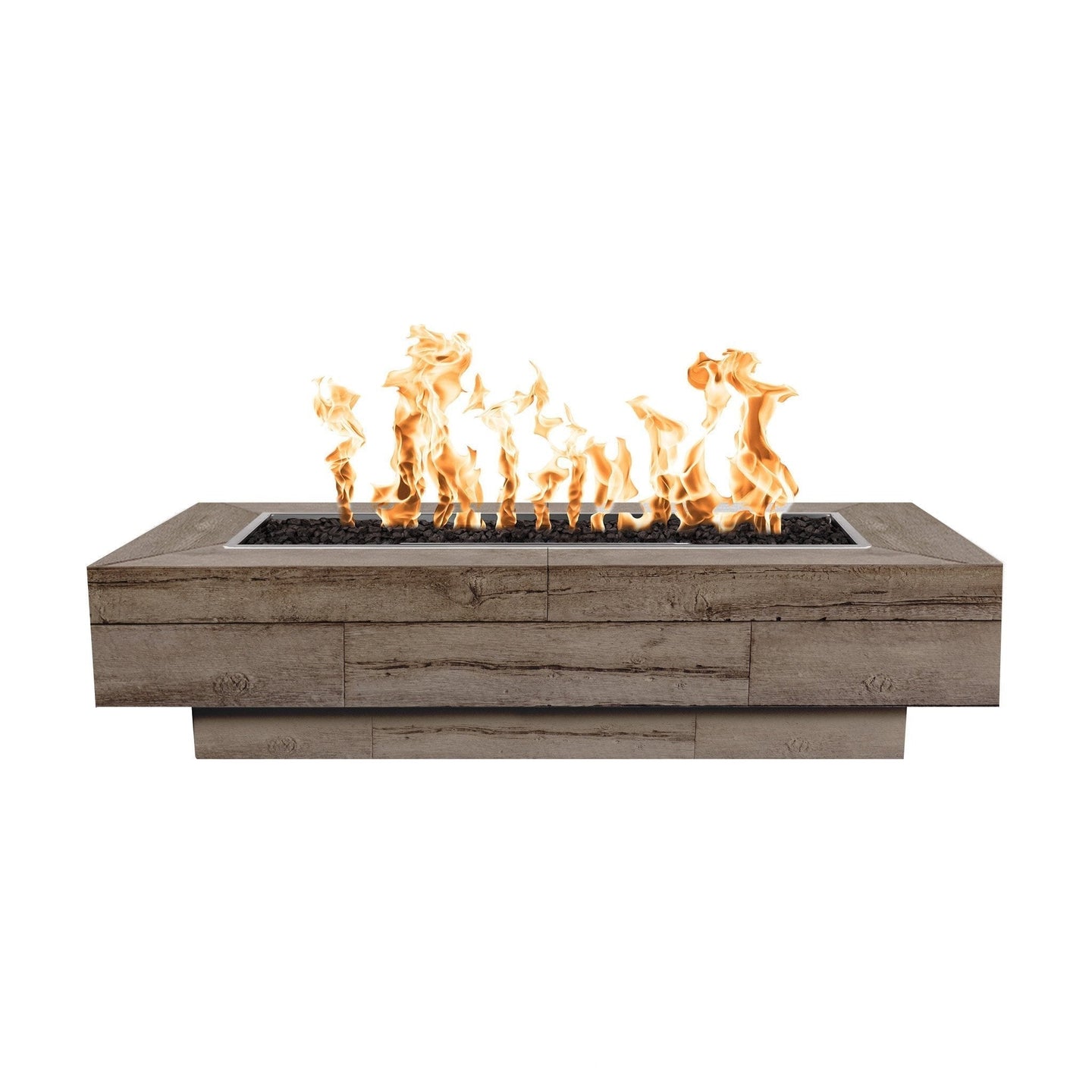 Where modern meets rustic, this Coronado boasts of a chic profile sure to impress. Relish up to 65,000 BTUs of heat output while enjoying a mesmerizing display of bright flames as they dance across the stainless steel burner. Lava rock, which is included with your Coronado, does a wonderful job at hiding your burner out of sight and adding a natural touch to your entertainment area. Choose between a match lit or electronic ignition system to best suit your living space needs. Though the exterior appears as wood, it is made from a durable glass fiber reinforced concrete formula that is designed to stand up to inclement weather. Since each fire pit is handcrafted here in the USA, colors and textures may vary.