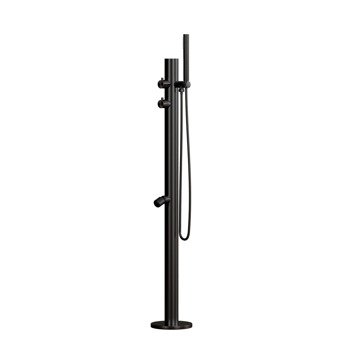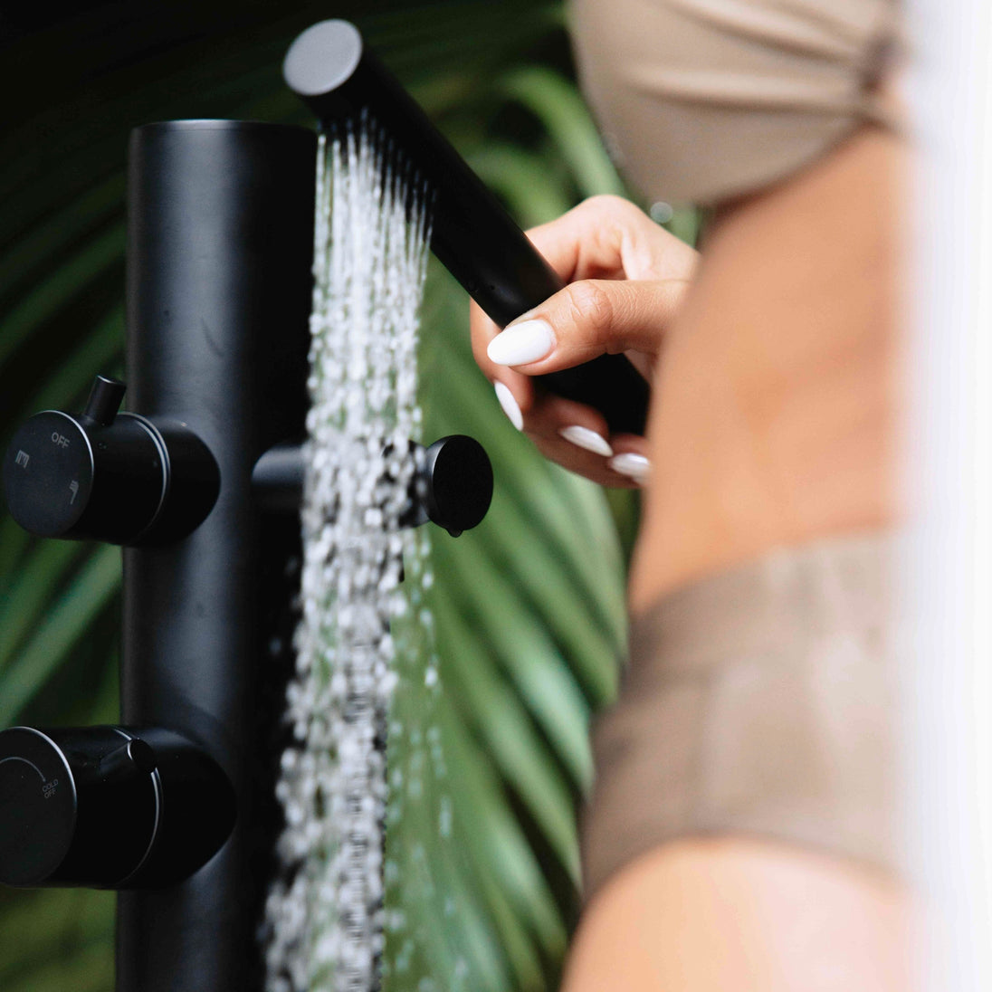 Freestanding outdoor rinse station with pressure balance valve, two-way diverter, foot wash, and hand shower made of 316 marine grade matte black stainless steel.